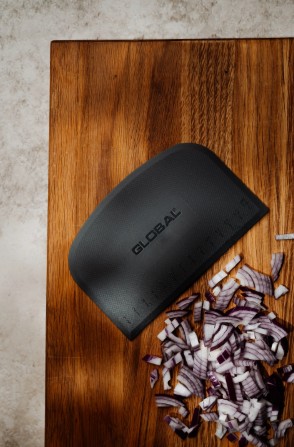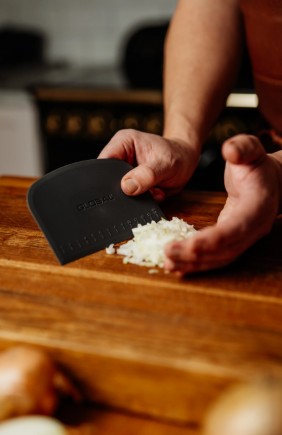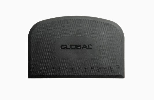 En bänkskrapa i flexibel plast som hjälper dig att hålla rent på skärbrädan och köksbänken. Skrapan kommer också väl till pass när du ska skära deg i jämna bitar, eftersom den är försedd med måttskala.
