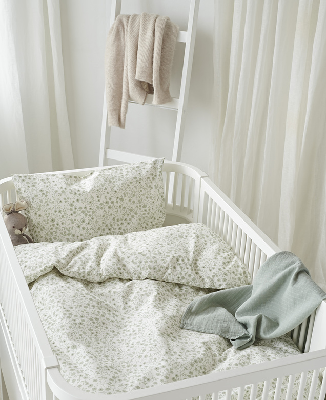 Bäddset bestående av ett örngott och ett påslakan med tryckt mönster. Passande storlek för spjälsäng och tillverkat i skön bomullskvalitet.