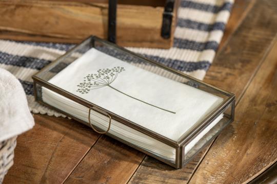 Rektangulär glaslåda med lock so passar perfekt att förvara sina servetter i. Håller dem på plats samtidigt som det blir en fin detalj på bordet.