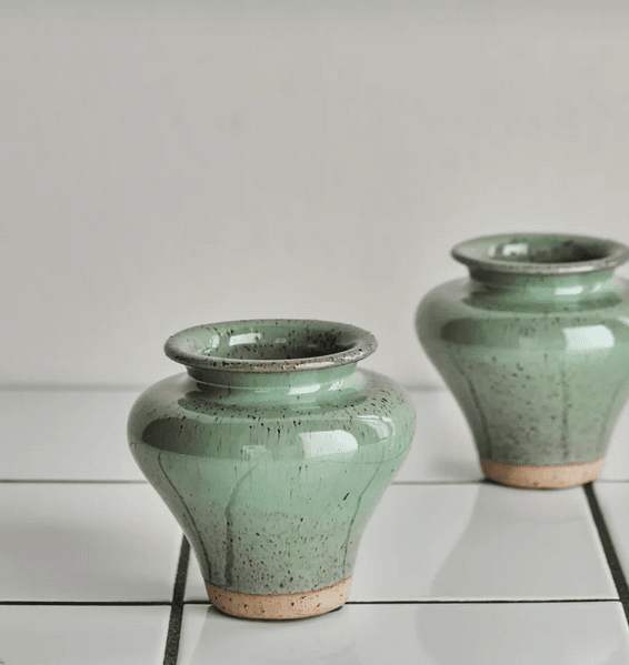 Ge din inredning ett elegant lyft med hjälp av denna Kolo-vas. En vas i lergods med en blank grön glasyr. Vasens voluminösa design gör dem till ett självklart blickfång, oavsett var du placerar den.