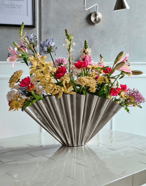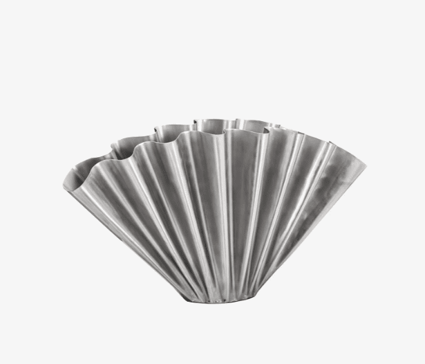 Den här fina vasen från House Doctor blir ett perfekt tillägg till alla hem, oavsett befintlig inredning. Vasen, Flood, är av järn, vilket ger ett industriellt och rustikt utseende tack vare sin metalliska färg. Den unika vasen har vikningar på varje sida, vilket ger den ett dynamiskt uttryck. De små vikningarna hjälper också till att hålla ihop blommorna så de inte faller ut på sidorna.