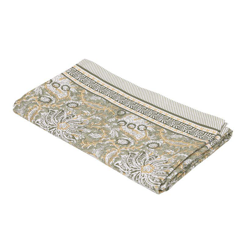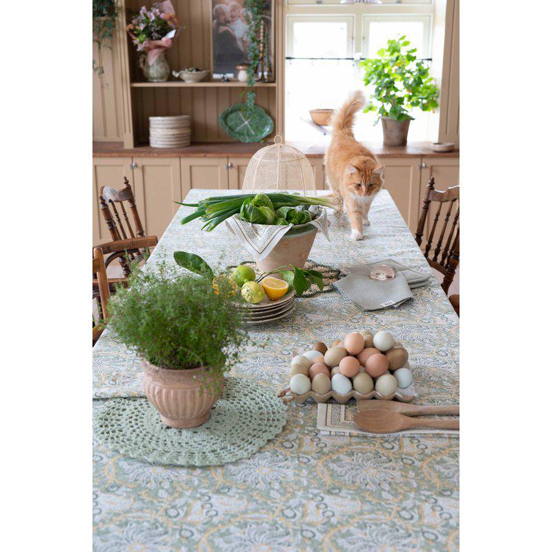 Duk i 100% återvunnen bomull med ett magnifikt mönster och med en vacker bård längs långsidorna i härliga färger, som skapar en inbjudande och ombonad känsla vid varje måltid.