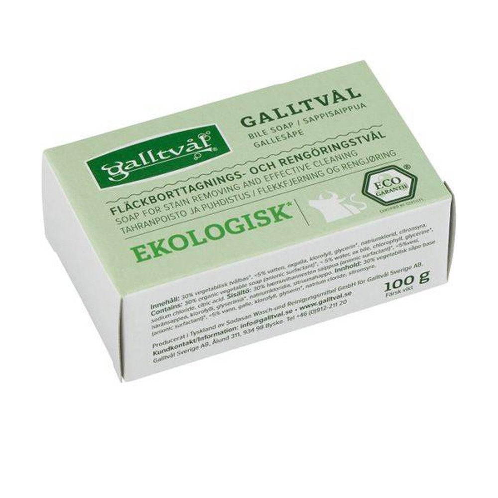 Produktbeskrivning:Galltvåls fasta rengörings- och fläckborttagningstvål är ett måste för alla som vill ha en smidig tvål för all sorts rengöring. Den innehåller bland annat oxgalla och klorofyll som är effektiva mot olja och fett respektive fläckar från gräs, bär, frukt och grönsaker. Tvålen innehåller inga kemiska ämnen, utan endast naturliga ämnen (inga genmanipulerade råvaror) och är därmed även biologiskt nedbrytbar. Galltvålen har inte testats på djur. Certifierad med Bra Miljöval