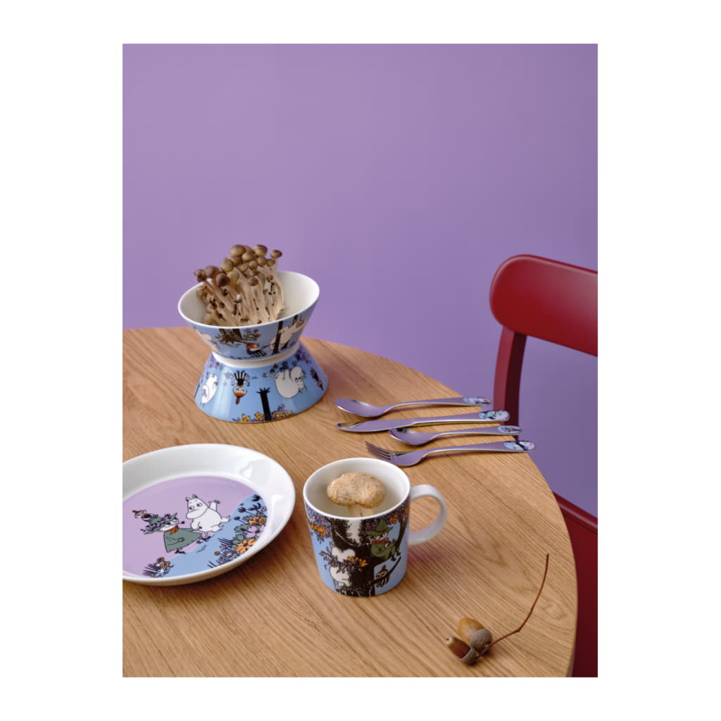 Muggen “Vänner för alltid” väcker nostalgi från barndomen av äventyr som att klättra i träd med sina bästa vänner. Snusmumriken har återvänt till Mumindalen. Mumintrollet längtar efter att träffa honom. Mumintrollet och Lilla My följer ett spår med ledtrådar som Snusmumriken har gömt. De leder till honom sittandes i ett träd. Moomin Arabia mugg 0,3 l, Vänner för alltid