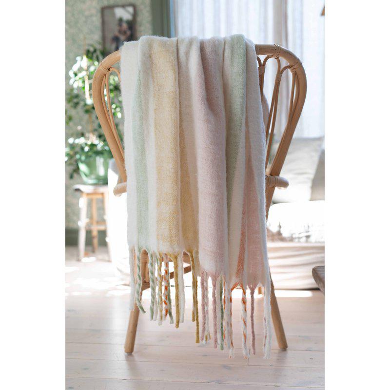 En fluffig och gosig pläd i härliga vårfärger med tjocka tvinnade fransar på kortsidorna, tillverkad i akryl och ull. Akrylfibrerna bidrar till att pläden behåller sin form och mjukhet över tid, medan ullen ger en naturlig värme och en lyxig känsla.